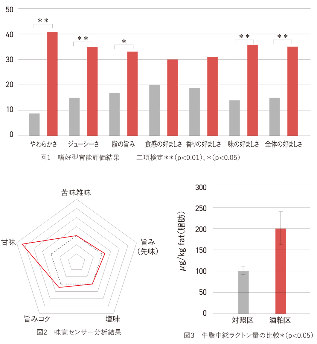 ●やわらかさ ●ジューシーさ ●脂の甘味 ●味の好ましさ ●全体の好ましさ 等の特徴が実証されました。